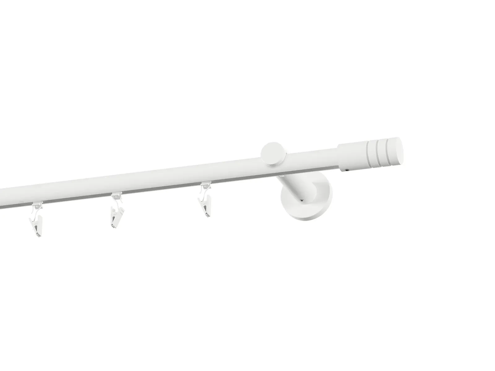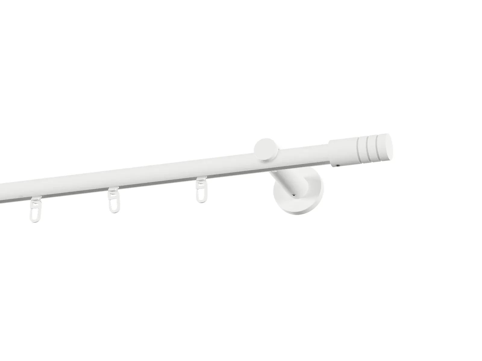 Jednoradová drážková garniža s povrchovou úpravou - biela lakovaná. Garniže sú dodávané sú v kompletoch. Tvar koncovky a typ držiaka podľa zadaného výberu.