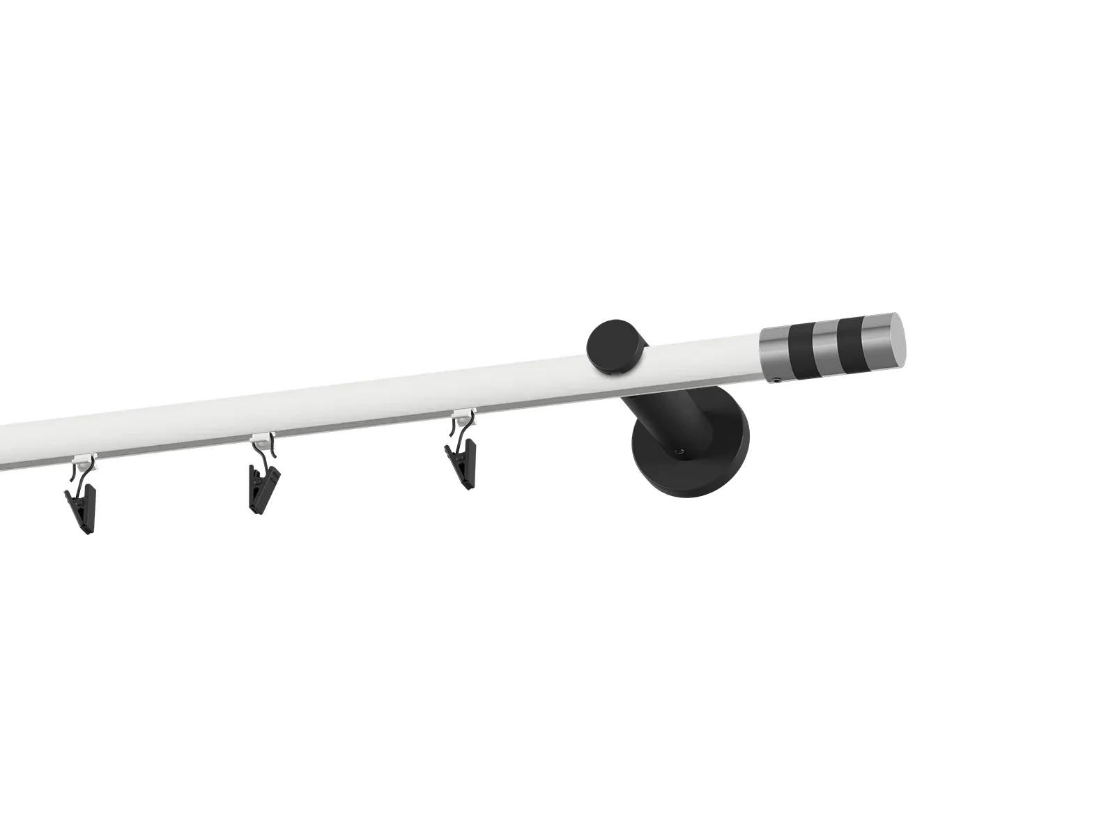 Jednoradová drážková garniža s povrchovou úpravou - bielo čierna lakovaná. Garniže sú dodávané sú v kompletoch. Tvar koncovky a typ držiaka podľa zadaného výberu.