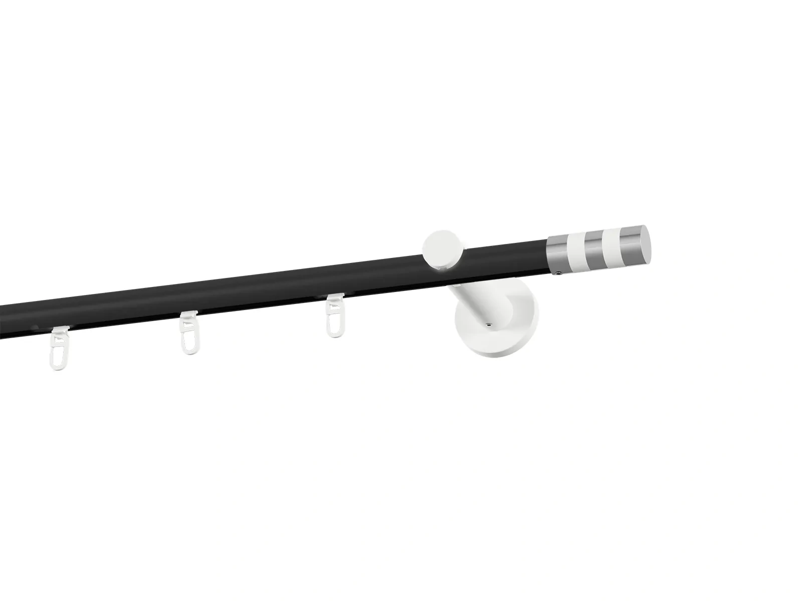Jednoradová drážková garniža s povrchovou úpravou - čierno biela lakovaná. Garniže sú dodávané sú v kompletoch. Tvar koncovky a typ držiaka podľa zadaného výberu.
