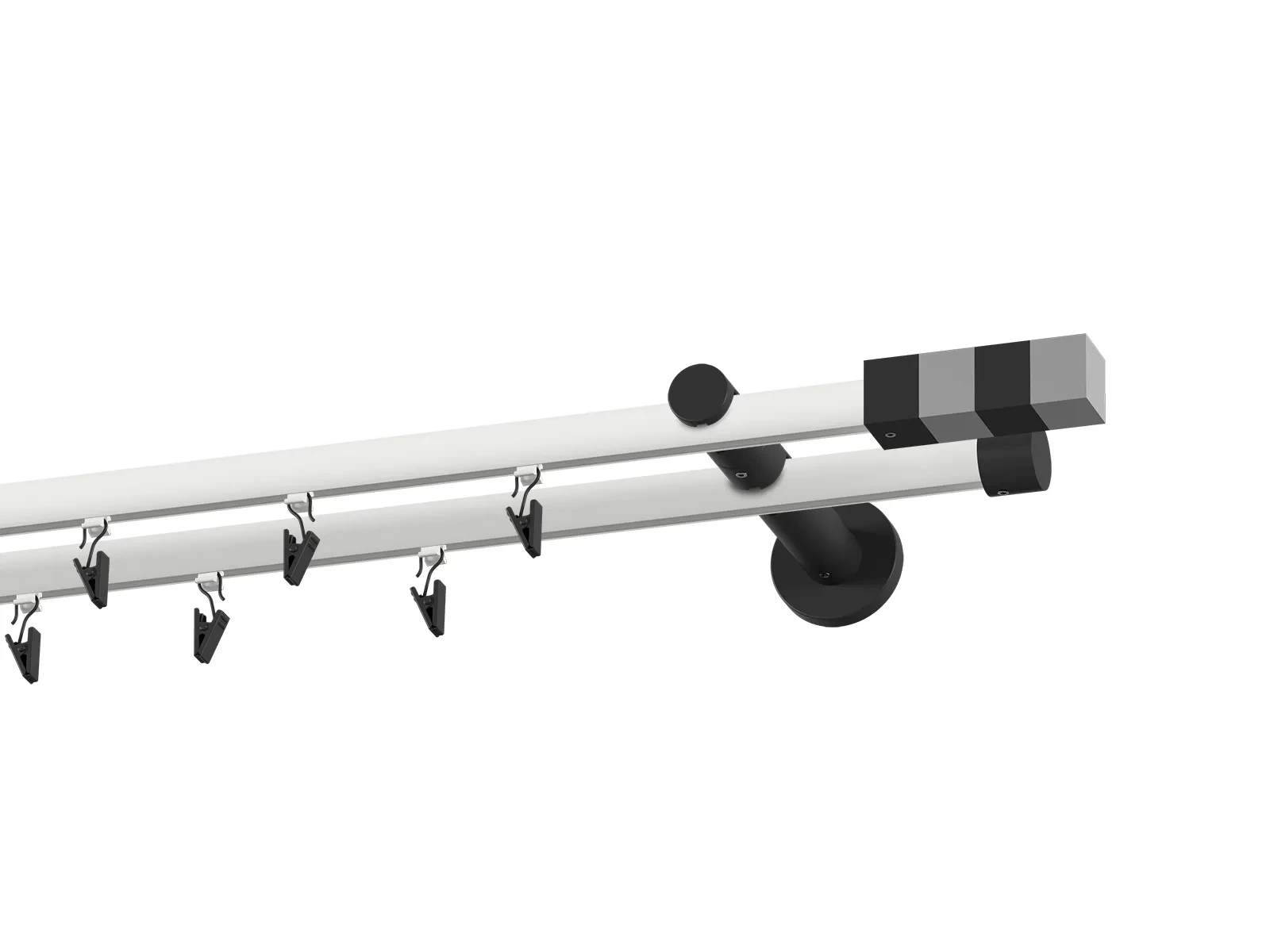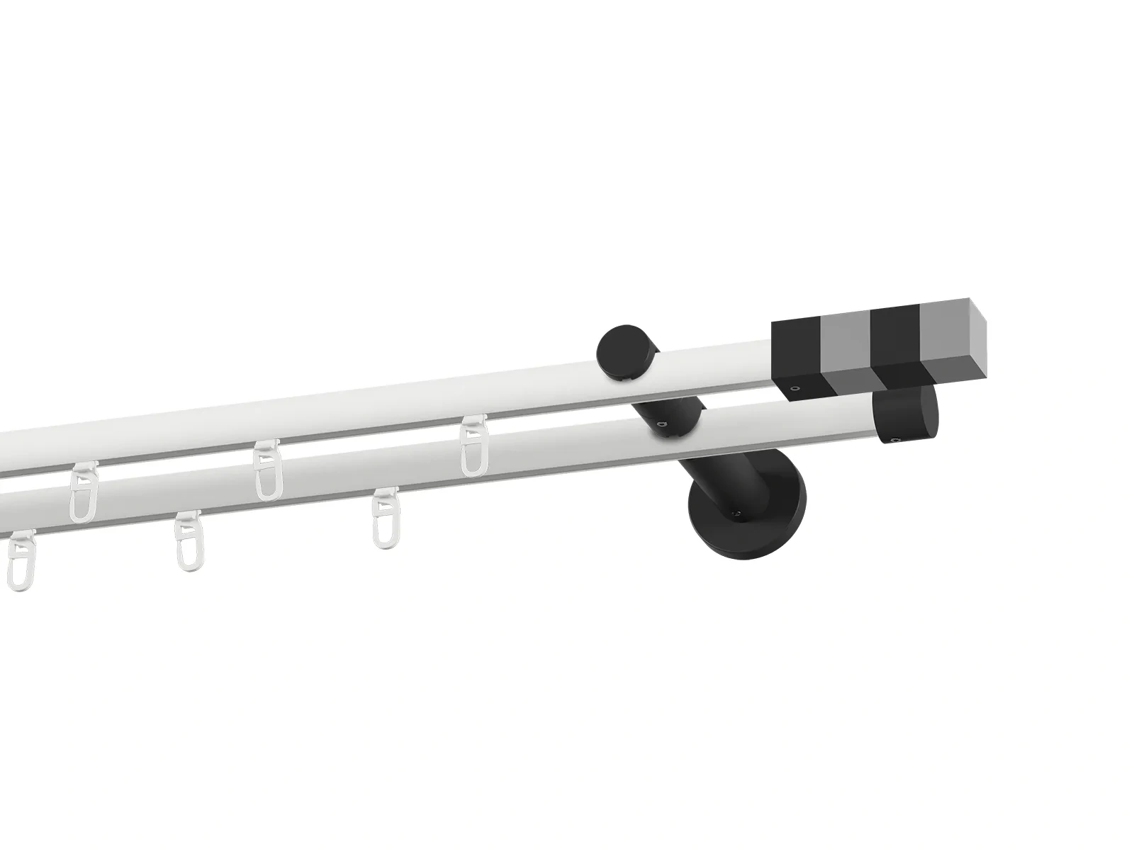 Dvojradová drážková garniža s povrchovou úpravou - bielo čierna lakovaná. Garniže sú dodávané sú v kompletoch. Tvar koncovky a typ držiaka podľa zadaného výberu.