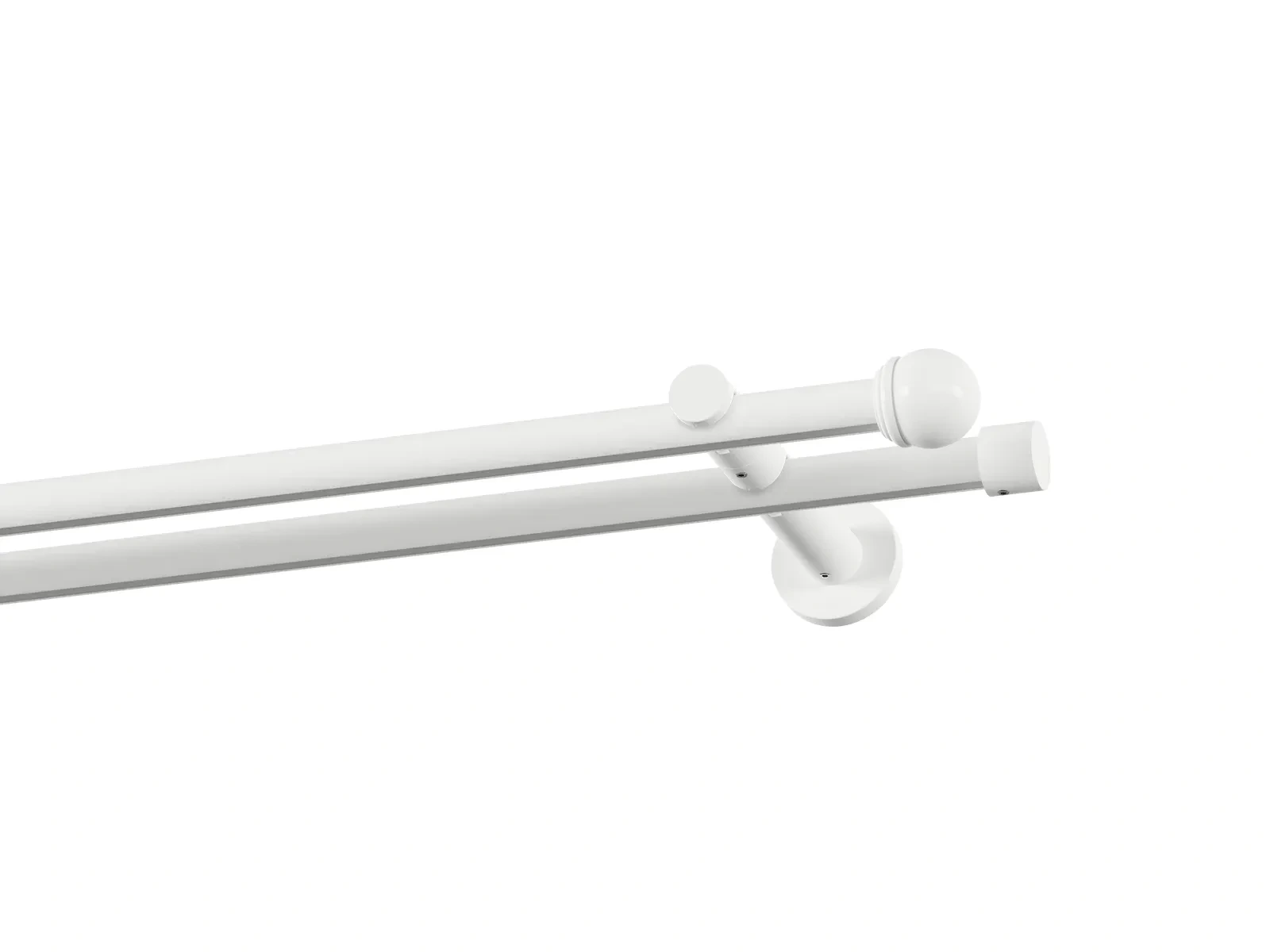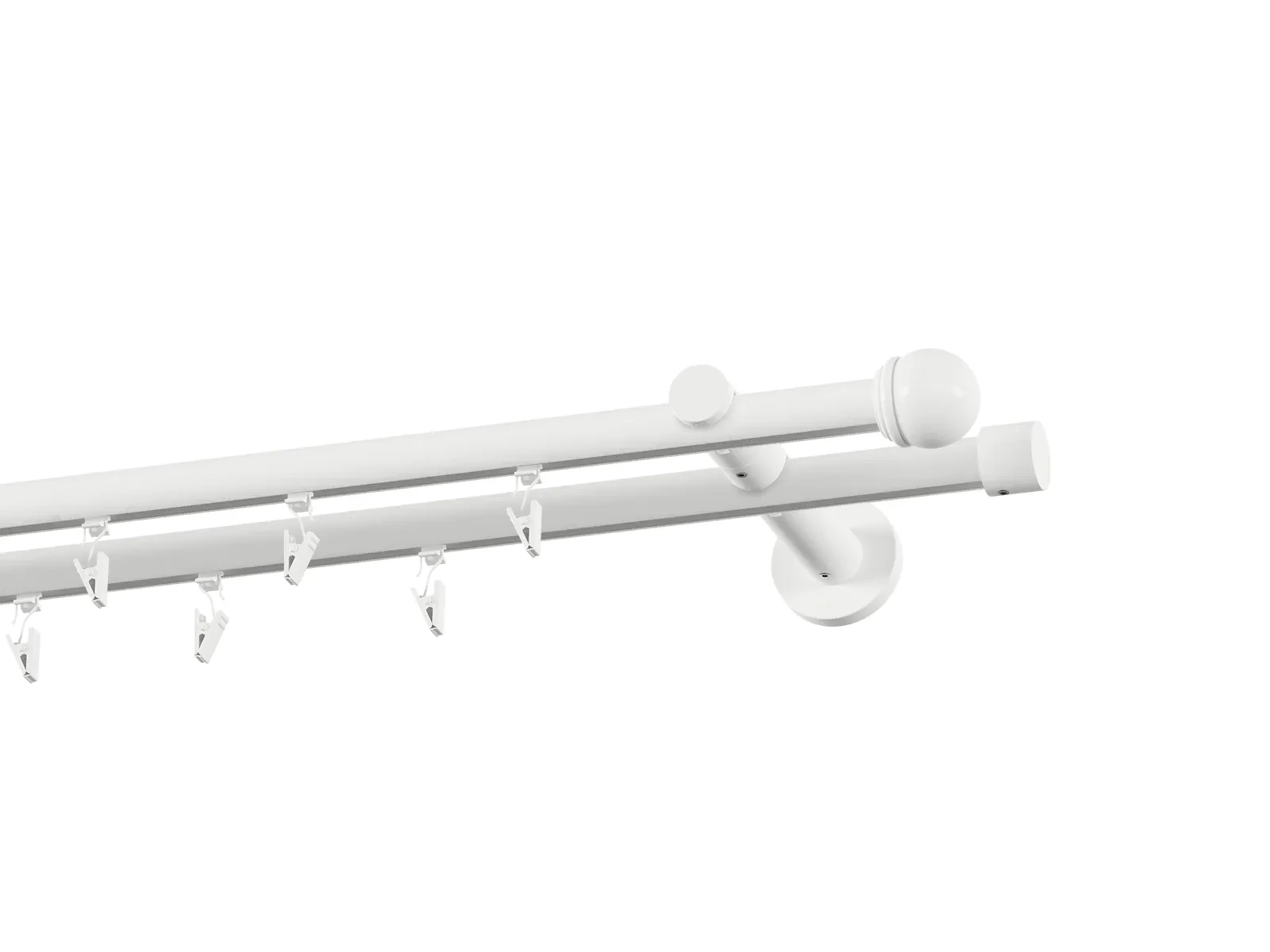 Dvojradová drážková garniža s povrchovou úpravou - biela lakovaná. Garniže sú dodávané sú v kompletoch. Tvar koncovky a typ držiaka podľa zadaného výberu.