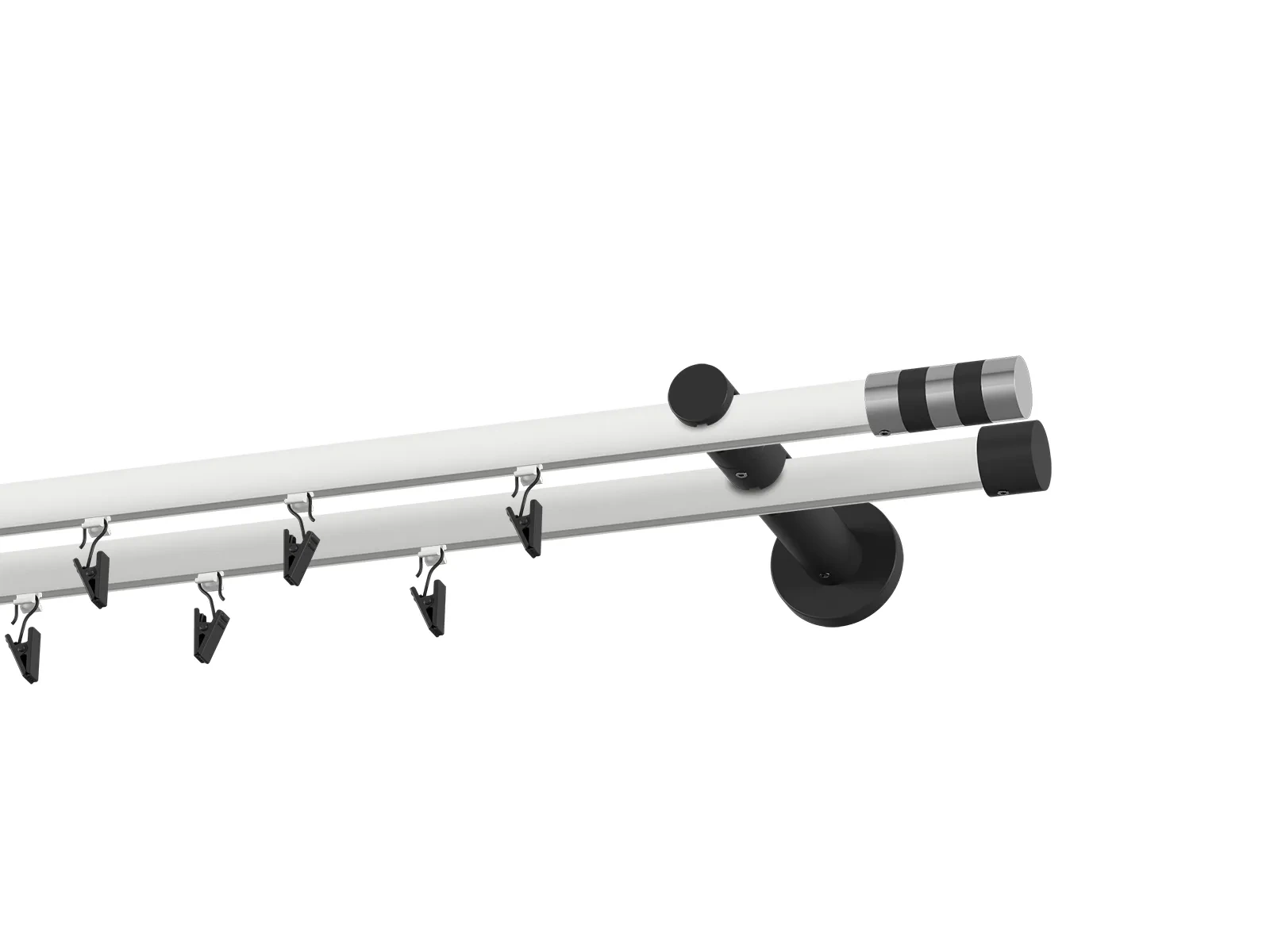 Dvojradová drážková garniža s povrchovou úpravou - bielo čierna lakovaná. Garniže sú dodávané sú v kompletoch. Tvar koncovky a typ držiaka podľa zadaného výberu.