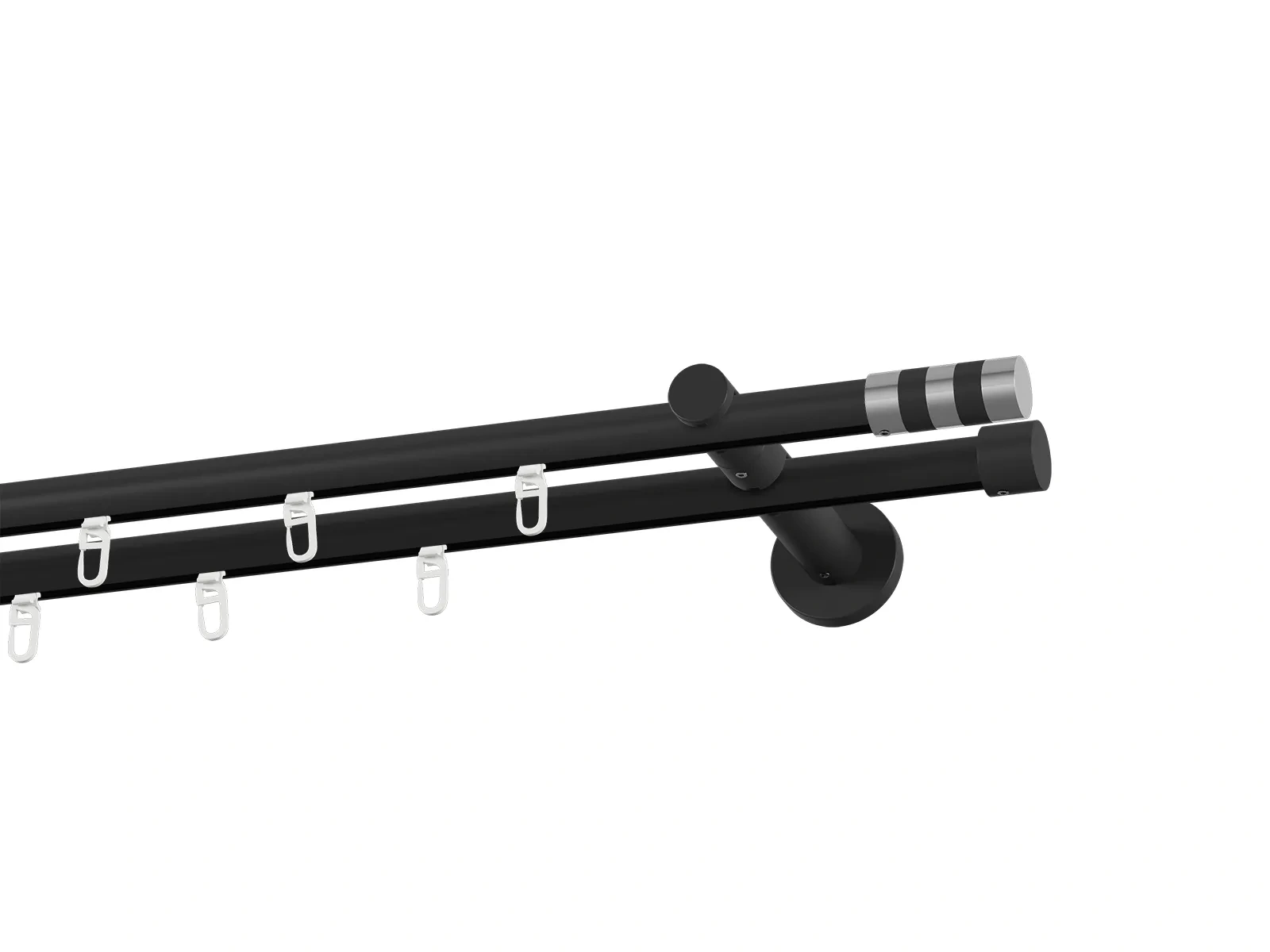 Dvojradová drážková garniža s povrchovou úpravou - čierna lakovaná. Garniže sú dodávané sú v kompletoch. Tvar koncovky a typ držiaka podľa zadaného výberu.