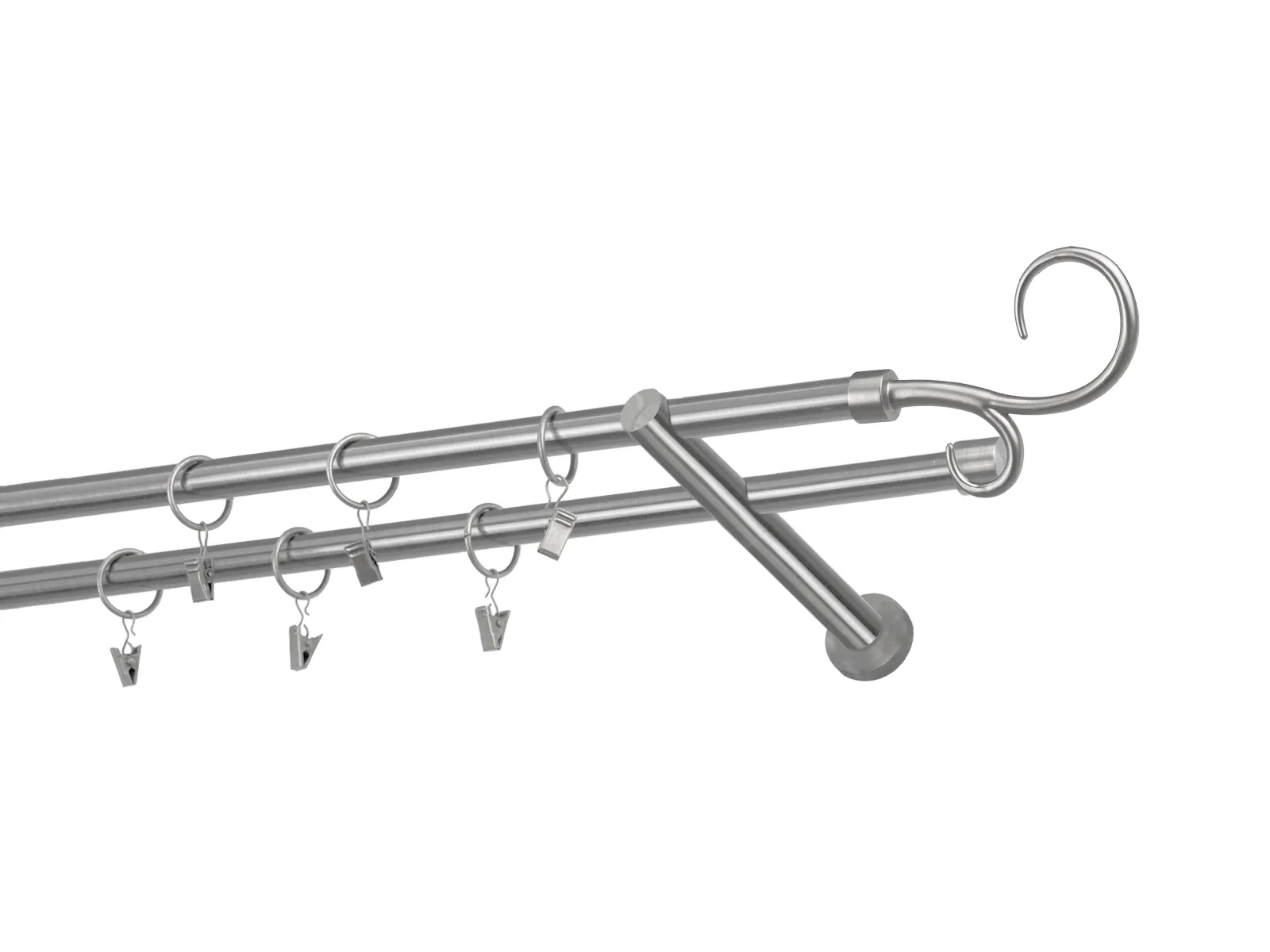Dĺžka 1600 mm - tyč 16mm - 1600mm - 2ks, držiak dvojitý - 2ks, koncovka - 2ks, koncovka zadná(PULLO) - 2ks, krúžok so štipcom - 30ks (pri výbere parametra príslušenstvo s krúžkami so štipcom), skrutky a hmoždinky na montáž